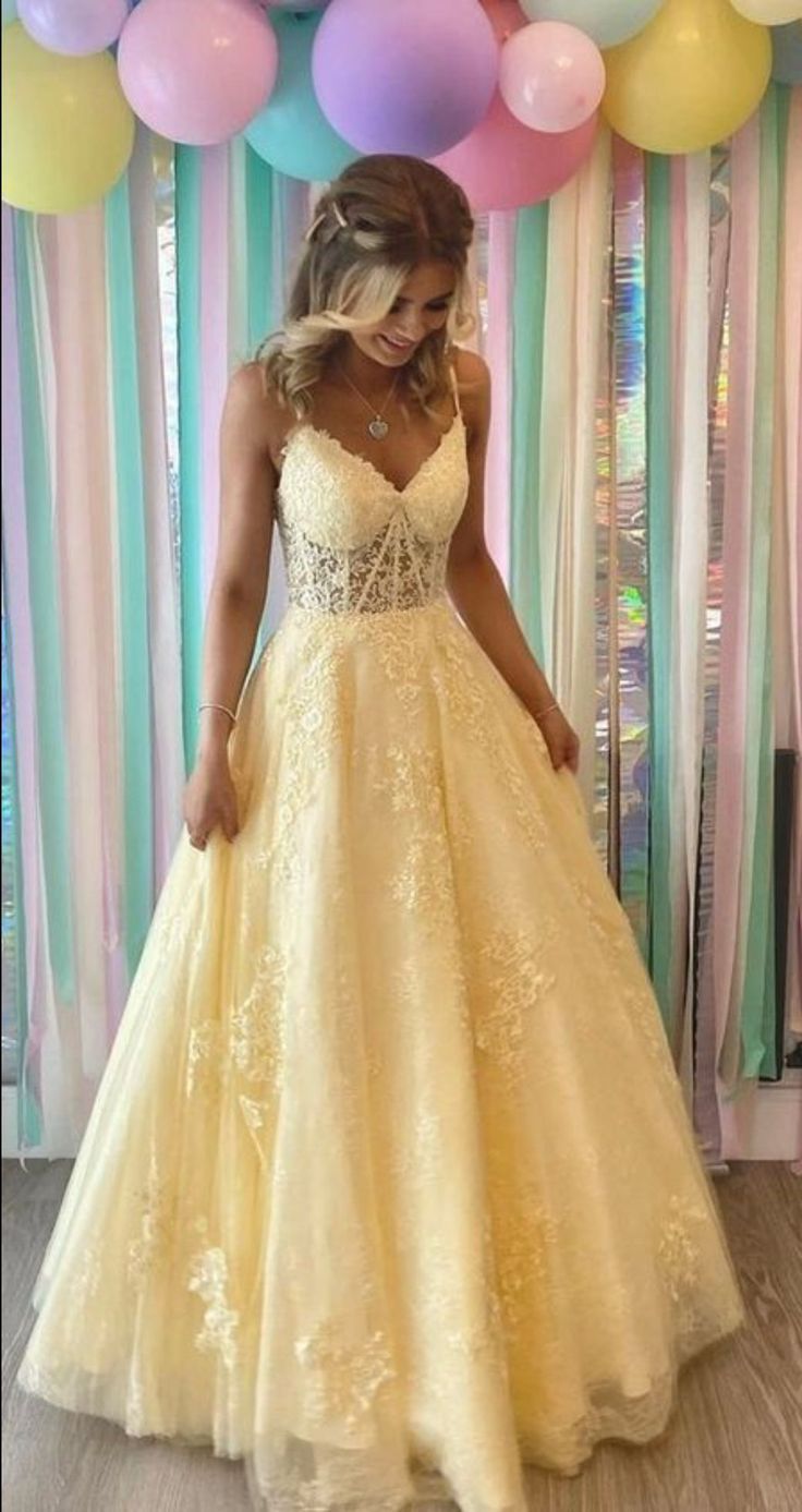 Beautiful Ball Gown Spaghetti Straps Yellow Lace Tulle Long Prom Dresses Inspiration Party Dress Prom Gowns HZ0311