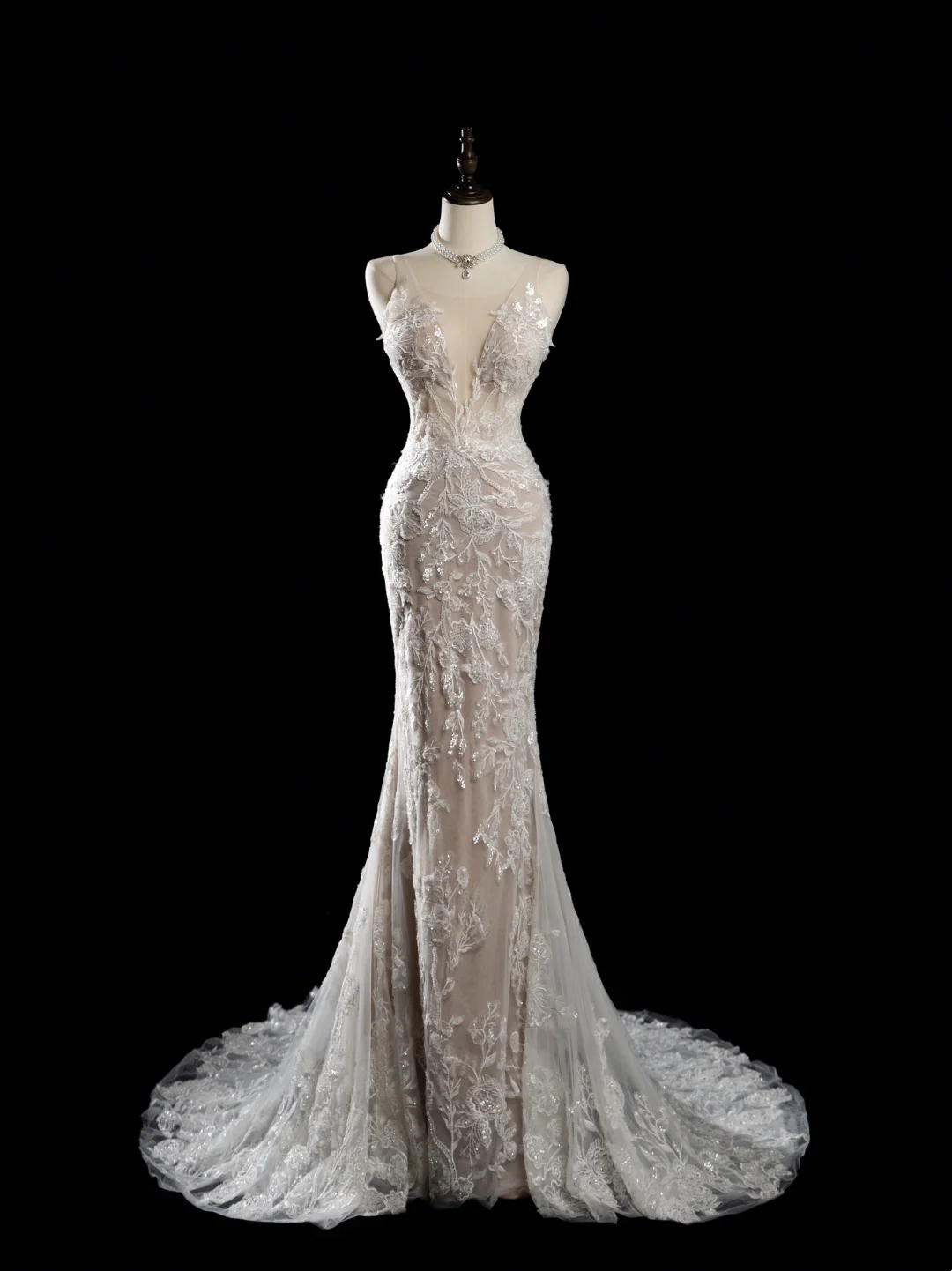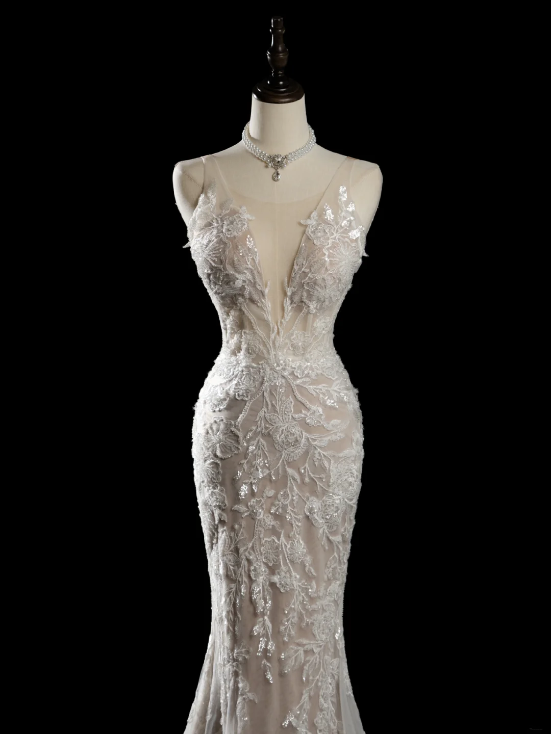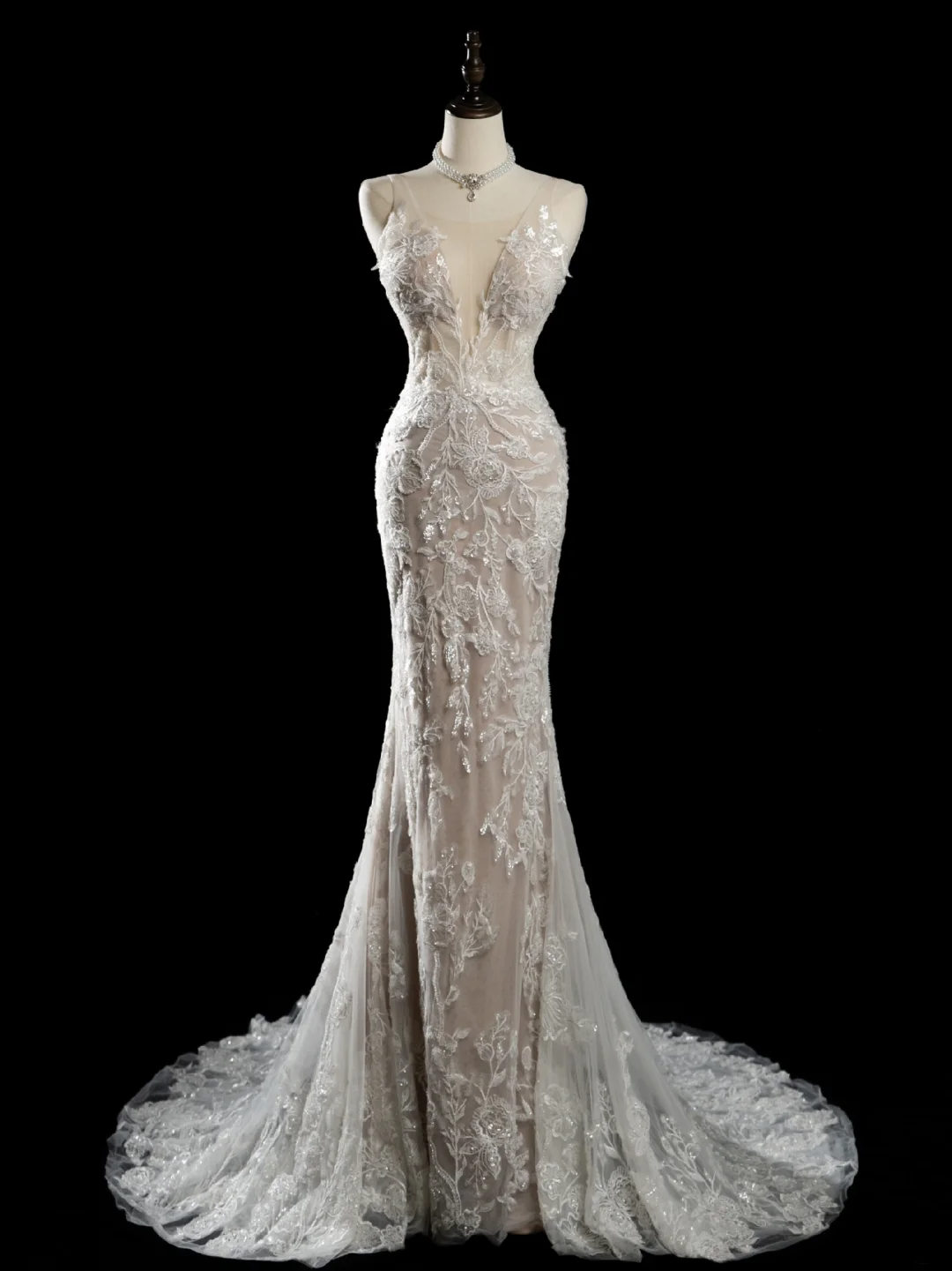 Vintage Mermaid Spaghetti Strap Sleeveless Sequin Lace Fitted Beaded Long Wedding Dress Bride Gown Wedding Dresses HZ0311